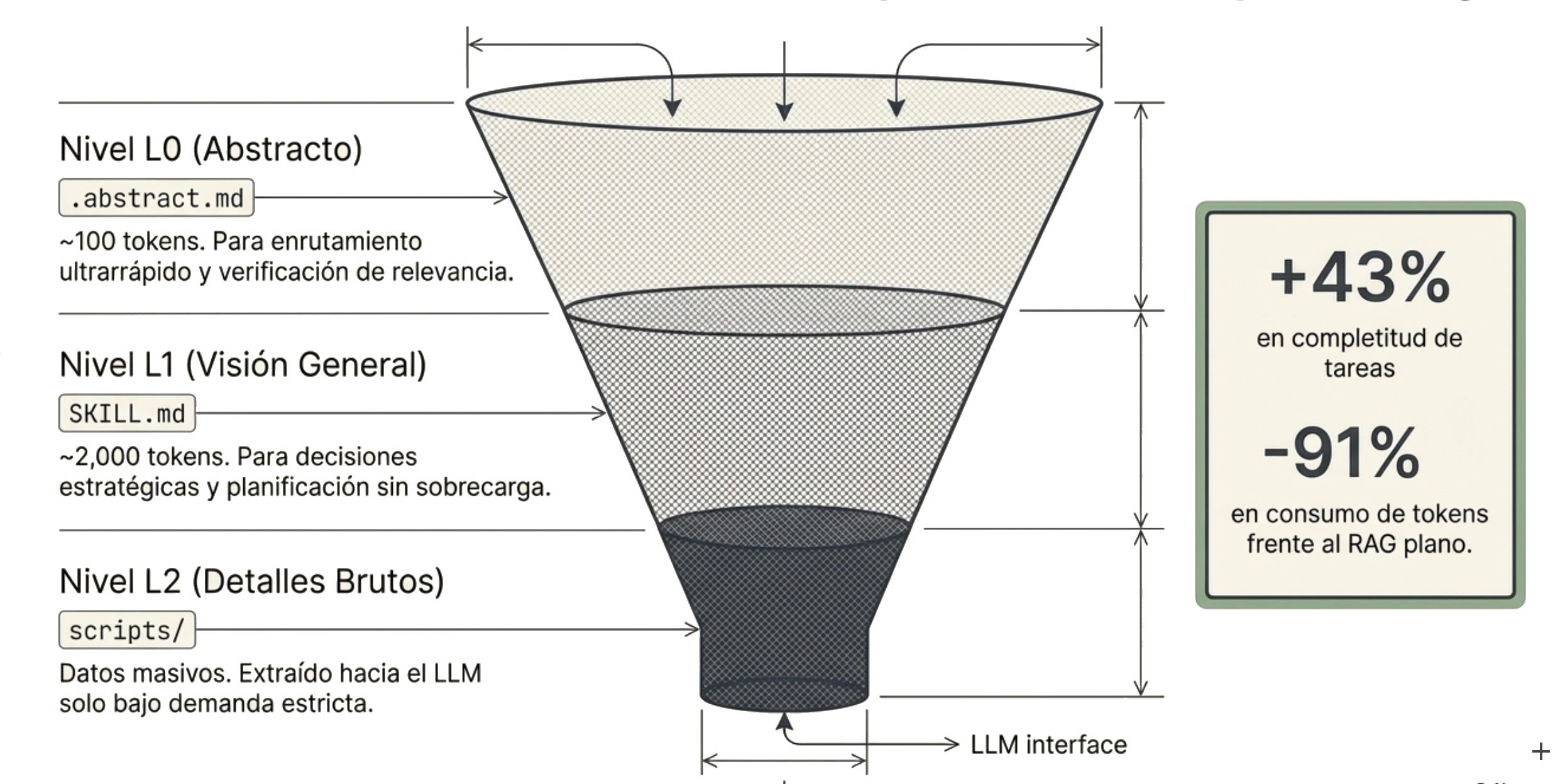 SKILL.mdactúa como router (~50 tokens) que apunta al módulo correcto. El agente no lee todo: lee el índice y va a lo que necesita.Resultado medido: ~650 tokens por tarea vs ~5.000 si cargaras todo de golpe. Un 87% menos.