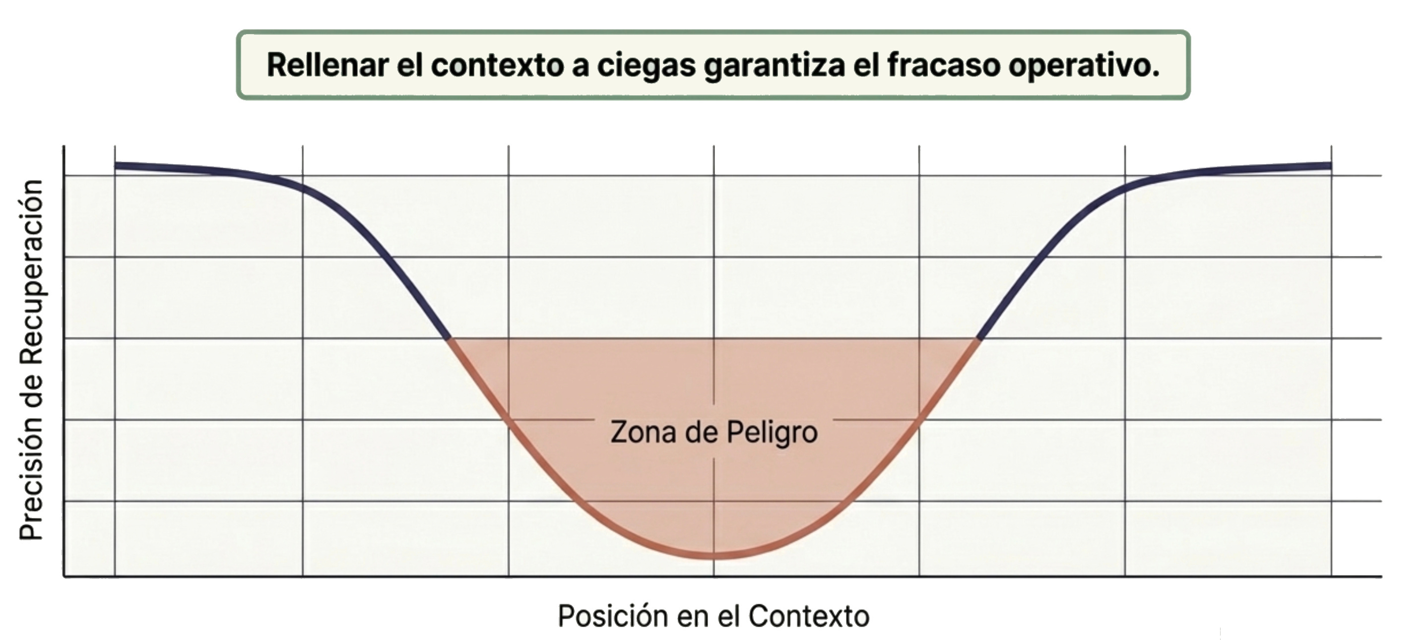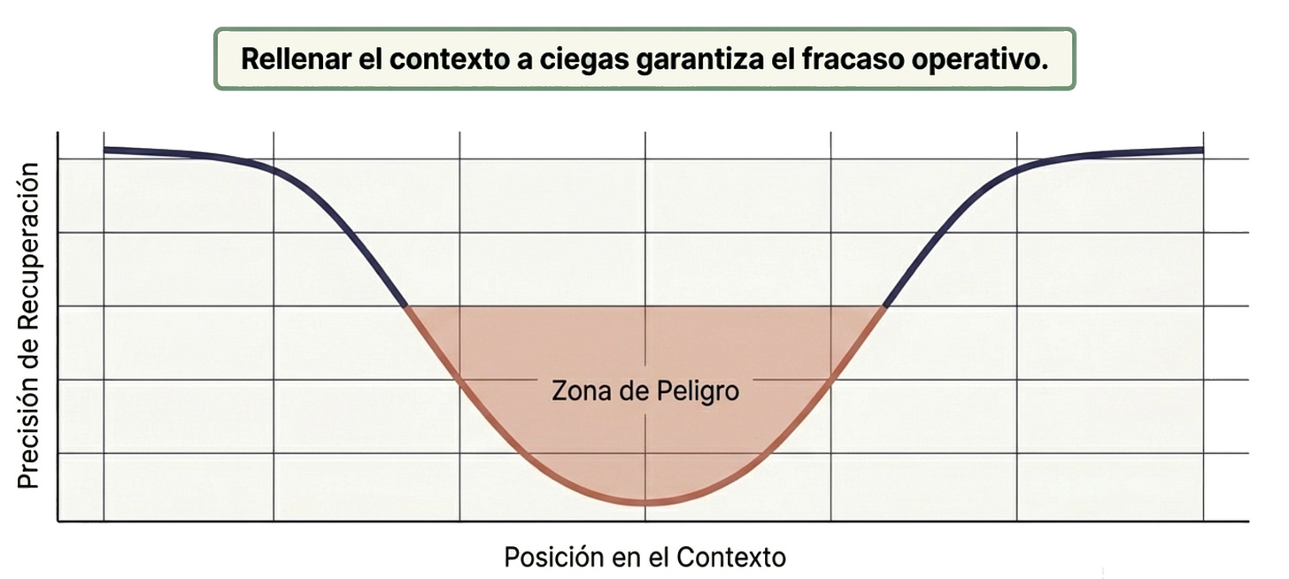 El efecto "Lost-in-the-Middle" (Perdido en el medio): Cuando inundas a la IA con documentación gigante, su nivel de atención forma una curva en "U". Recuerda muy bien lo que pusiste al principio y al final del documento, pero la precisión y el recuerdo de la información que queda enterrada en el medio del texto sufre una caída de entre el 10% y el 40%