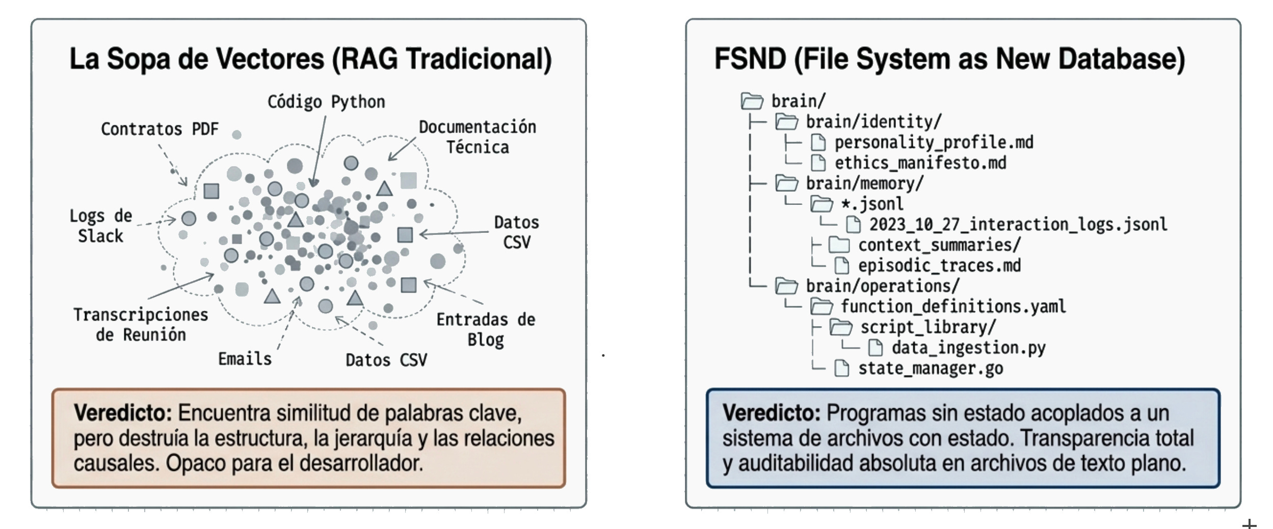 La memoria IA es una sopa matemática gigante. Consecuencia → es una caja negra en la que si algo falla, no hay una jodida forma de encontrar la causa y depurar.